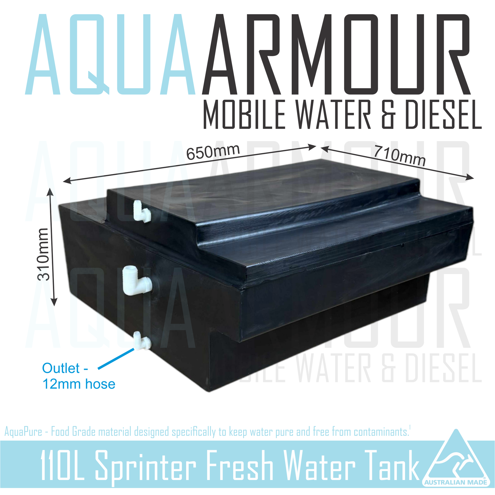 The AAM110 Mercedes Benz Sprinter Fresh Water Tank was specifically designed to fit extra long wheelbase models between diff and spare tyre4.
