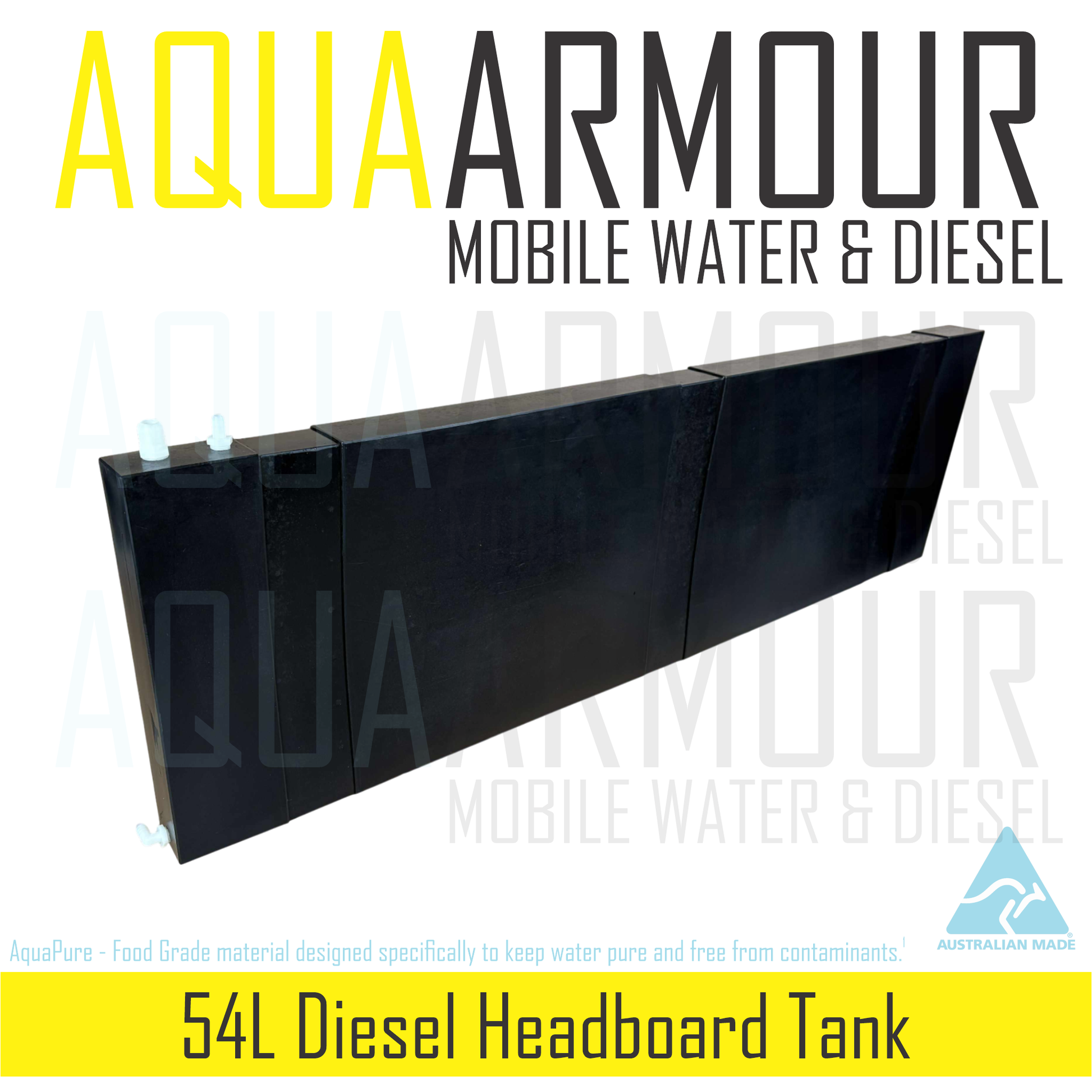 54L Diesel Headboard Tank may have slight change in appearance such as change in filler inlet and addition of diesel only sticker. This product is different in materials used to manufacture and in some cases has a greater wall thickness, but retains shape and black colour of water tank variant.